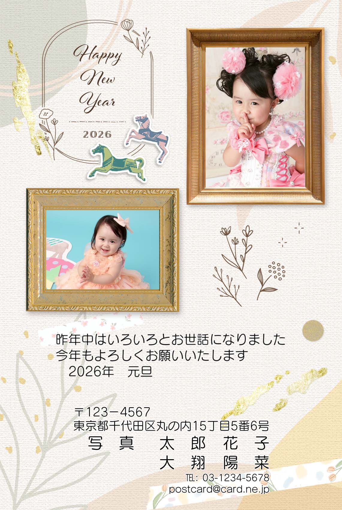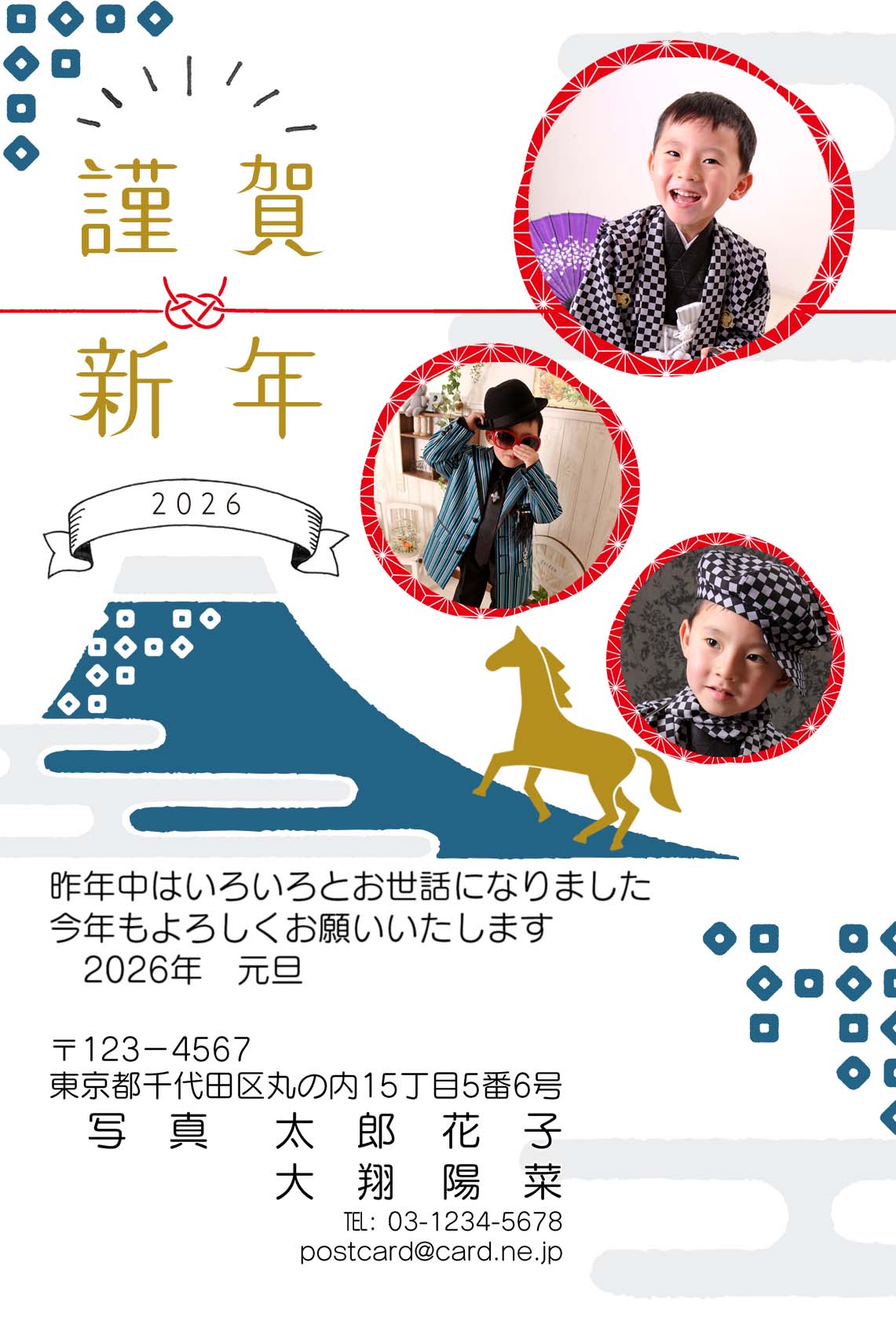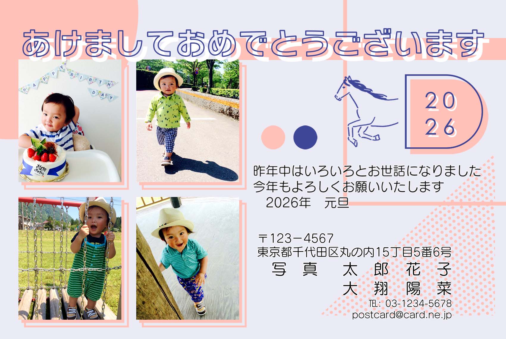 ベースデザイン8種類×カラー3種類×賀詞3種類×写真枠のバリエーション3種類の合計216通りのデザインをお選びいただけます。